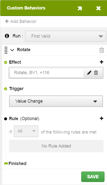 Add a rule. Rules are optional unless a Value Change trigger is used for the Custom Behavior. See Working with Rules.