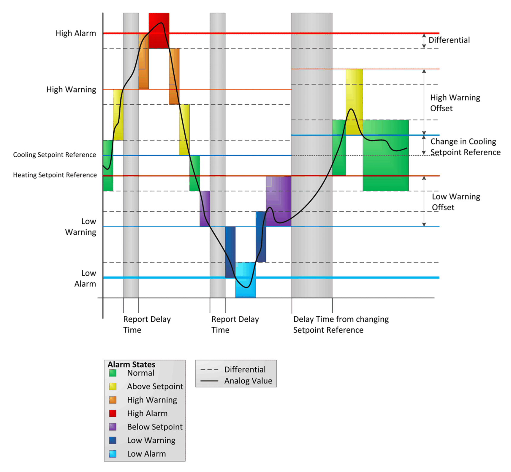 The Report Delay period starts when the Present Value transitions to any Alarm or Warning state from a Normal, Above Setpoint, or Below Setpoint state, or if the value of the Command Reference changes. All other State Transitions are reported immediately.