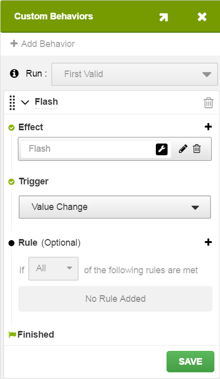 - Add a rule. Rules are optional unless a Value Change trigger is used for the Custom Behavior. See Working with Rules.
