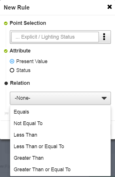 Note: A Compare Point does not account for display precision as defined on the point. The actual value is used for comparisons.For the Status attribute, select one or more Statuses.Figure: Status