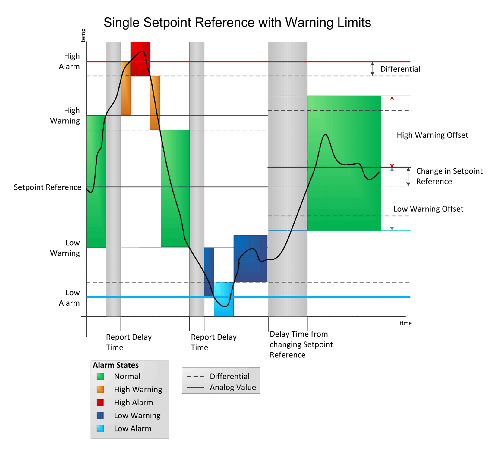 - Defined alarm and warning limits. Once you set the High and Low Alarm Limits, the High Warning Limit is calculated by adding the High Warning Offset to the Cooling Setpoint Reference Value. The Low Warning Limit is calculated by subtracting the Low Warning Offset from the Heating Setpoint Reference Value.